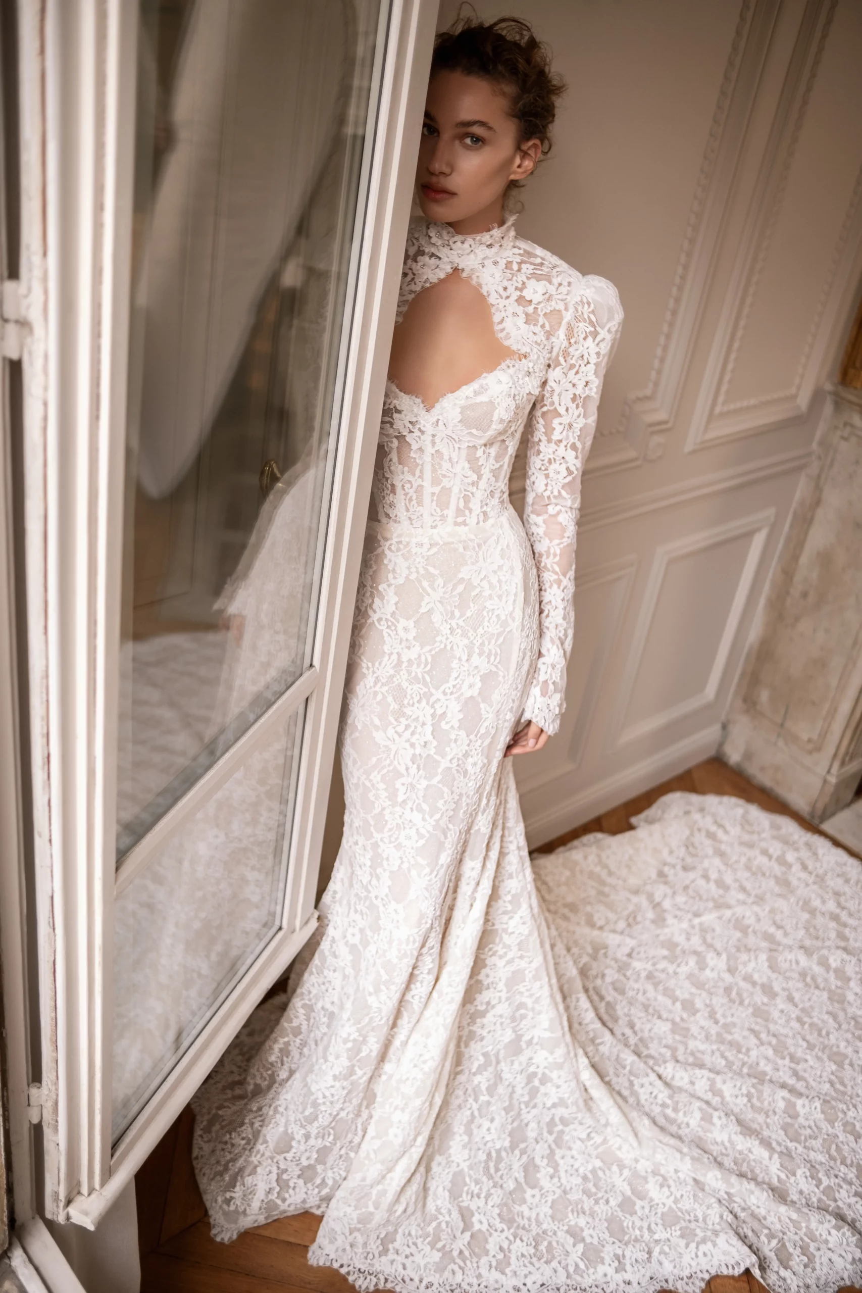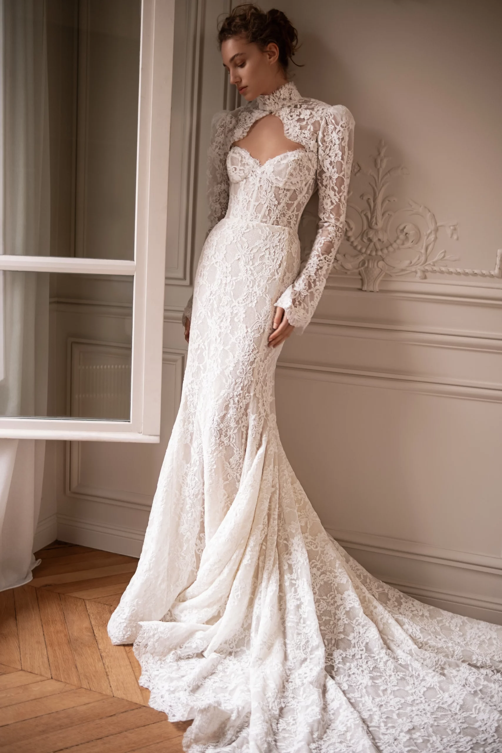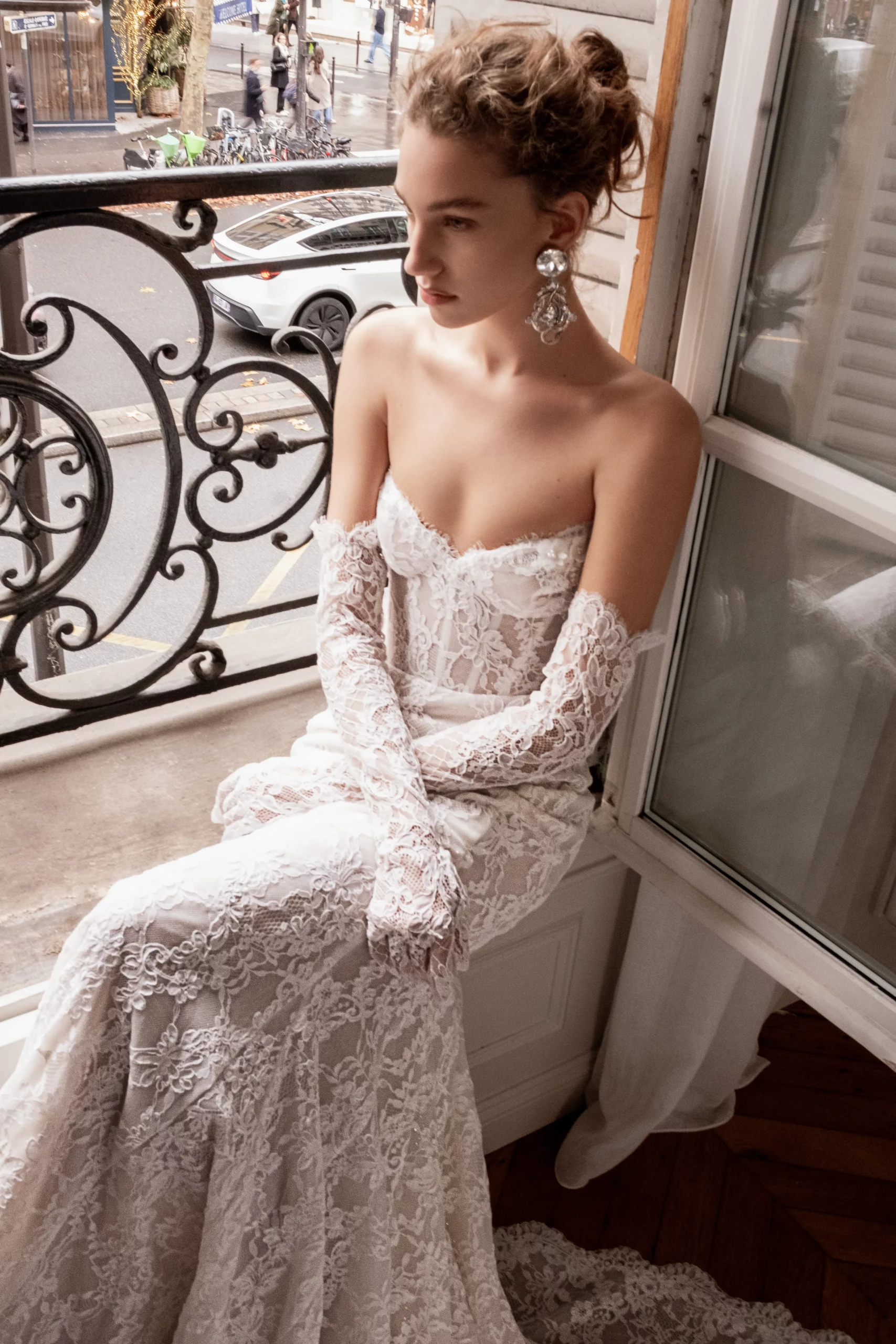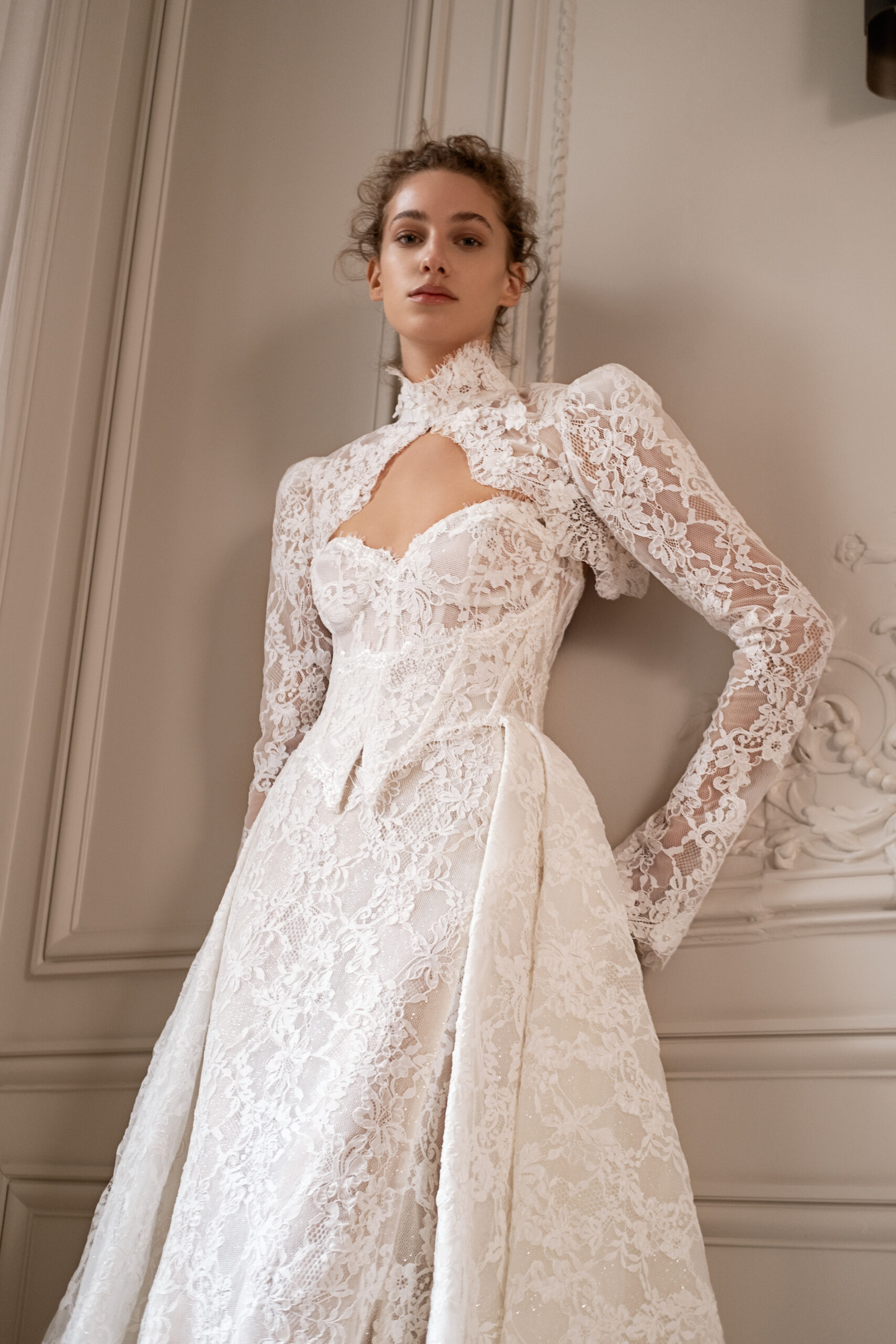 A lace wedding gown featuring a structured corset bodice with defined cups that enhance the feminine silhouette. The design offers the option of a lace bolero and matching gloves for added versatility. It also includes a detachable overskirt worn with a corset-style belt that appears as a seamless extension of the bodice, creating an extended back with a train and a Victorian-inspired look. When removed, the gown reveals a clean, classic lace silhouette with a modern presence.