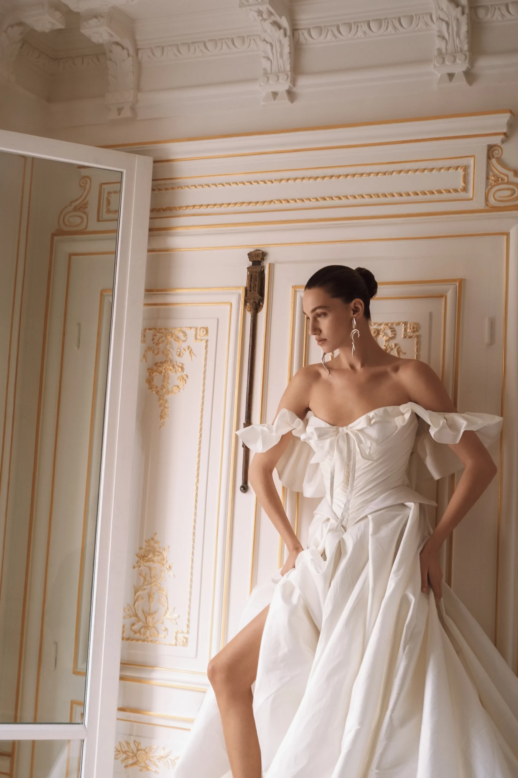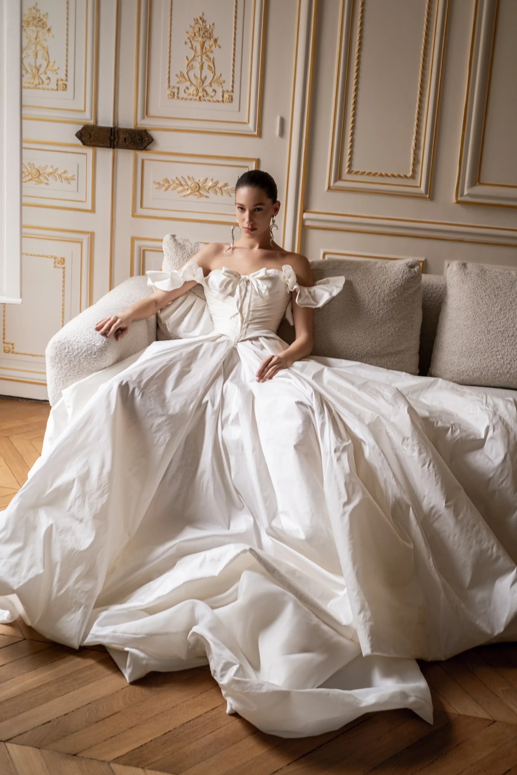 A silk taffeta wedding gown featuring a structured corset with soft draping and sculpted pointed sides that define the waist. The sleeves are adorned with delicate ruffles, framing the shoulders with refined volume. An airy skirt with a full balloon hem flows into a rich train, creating a regal silhouette inspired by Baroque elegance.